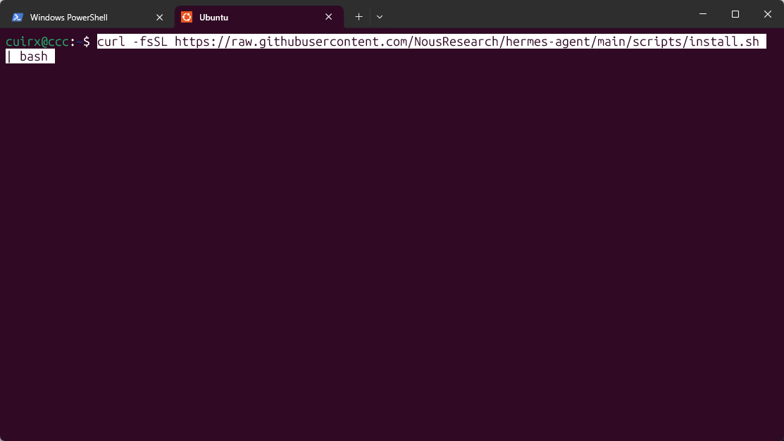 curl -fsSL https://raw.githubusercontent.com/NousResearch/hermes-agent/main/scripts/install.sh | bash