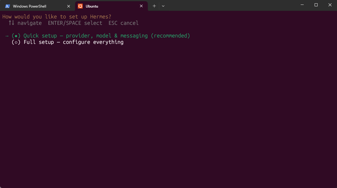 hermes agent 提供了 linux、macos、wsl2 的安装方法,在 window 使用时,推荐 wsl2 安装